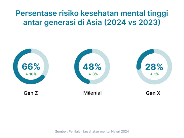 Generasi Milenial (lahir antara tahun 1981 dan 1996) juga sangat terdampak, dengan 48% menghadapi tantangan kesehatan mental. Sebaliknya, Gen X (lahir antara tahun 1965 dan 1980) tampaknya jauh lebih baik, dengan 28% tergolong berisiko tinggi.